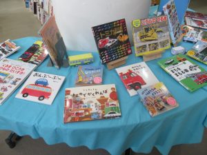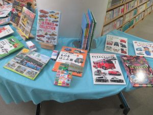 車の絵本や車の図鑑、車を使う仕事の本、トミカの本など、幅広い内容の本を展示しています。