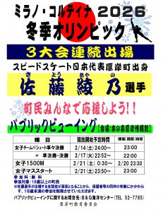 厚岸町出身、スピードスケート日本代表の佐藤綾乃選手がミラノ・コルティナオリンピックに出場されるということで、明日から情報館では佐藤綾乃選手が出場する競技に合わせてパブリックビューイングを開催します!